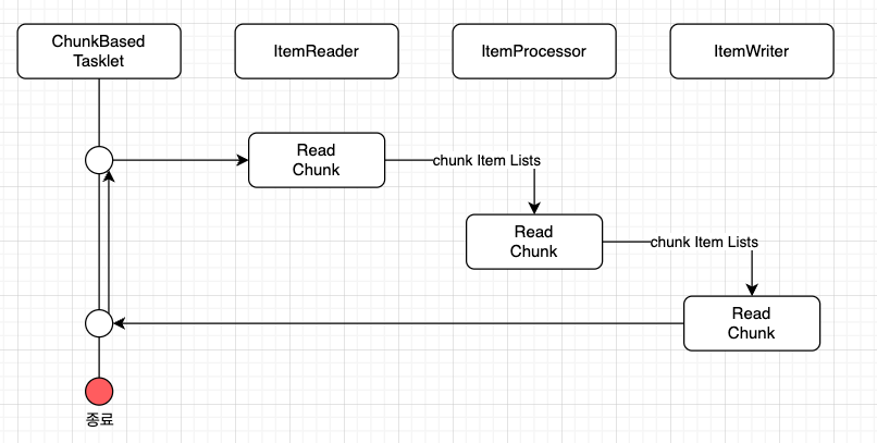 - Chunk 단위 만큼 ItemReader, ItemProcessor, ItemWriter 구현체를 반복 실행